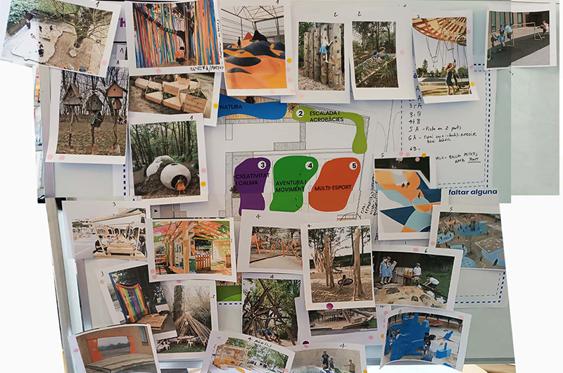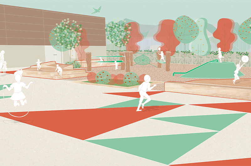 A partir de las actividades participativas se definen nuevas áreas de juego y estancia, entre las que destaca el oasis, la renaturalización de una pista deportiva que se transforma en un espacio verde y multiaventura.