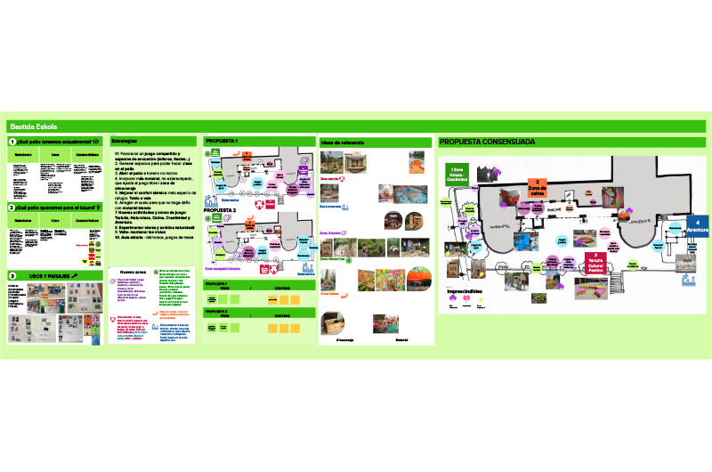 A partir de una visita técnica de nuestro equipo y de la formación metodológica ofrecida al profesorado, la escuela realiza las actividades participativas de forma autogestionada para reflexionar sobre las necesidades y carencias del patio actual. Por último, se realiza una sesión de puesta en común a partir de la cual se definen las estrategias y objetivos de la transformación del patio.